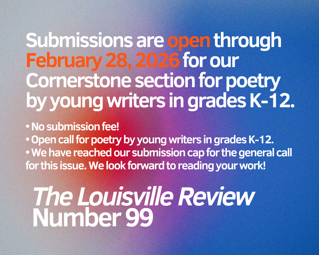 The Louisville Review accepts submissions of previously unpublished poetry from students in grades K-12 for publication in our Cornerstone section. We seek writing that embodies fresh ways to recreate scenes and feelings. Cornerstone submissions must be accompanied by parental permission to publish if accepted.