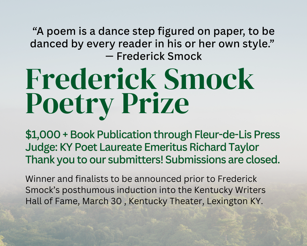 Winner and finalists to be announced prior to Frederick Smock’s posthumous induction into the Kentucky Writers Hall of Fame, March 30 , Kentucky Theater, Lexington KY.
